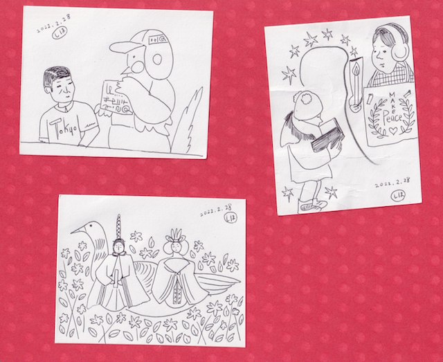 2/28新聞画 BLOG 2022.02.282022.03.01 今日の新聞の中から目についたものを描きました。(しほ) 共有:クリックして Twitter で共有 (新しいウィンドウで開きます)Facebook で共有するにはクリックしてください (新しいウィンドウで開きます) 関連